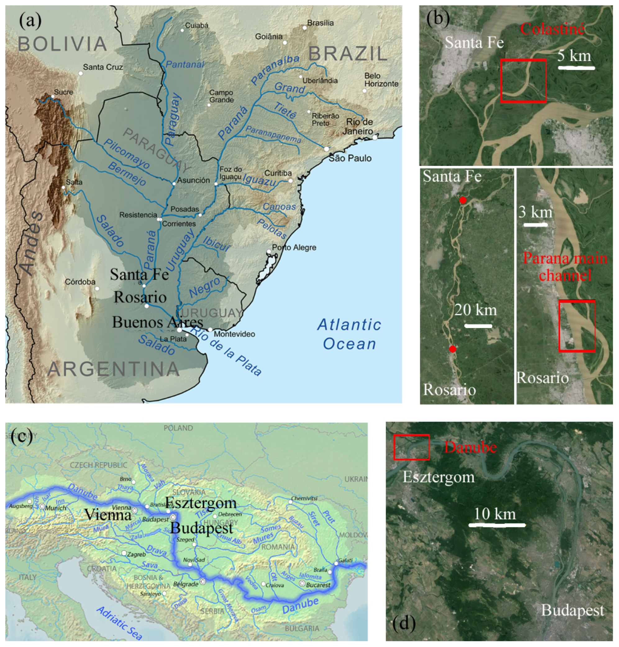 (a) The Parana-Paraguay watershed and (b) sampling sections in the Parana River and the Colastiné River (a Parana River secondary reach) close to Santa Fe and Rosario (Argentina); (c) The Danube River watershed and (d) its section in Hungary at Esztergom investigated by using the LISST-SL device by Sequoia Inc (Bellevue, WA, USA).