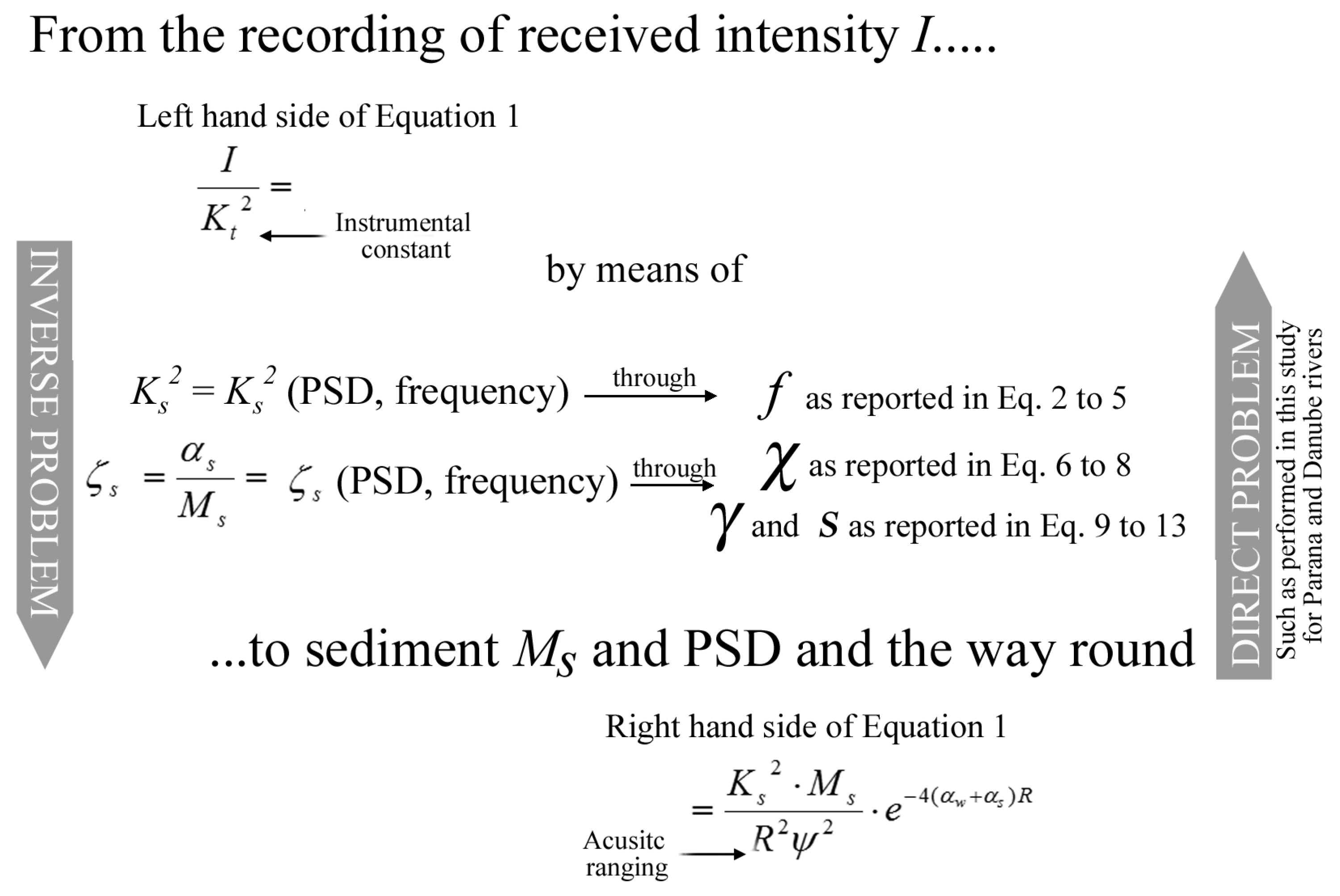 The echo intensity levels (in the left hand side of Equation (1)) measured by an ADCP in a dB scale are usually related to the backscattering strength and sound attenuations due to suspended sediments (in the right hand side of Equation (1)). These are, in turn, related to sediment features as reported in Equations (2)–(16). These relations enable the assessment of sediment features from ADCP recordings, which is refereed to as the inverse problem solution.