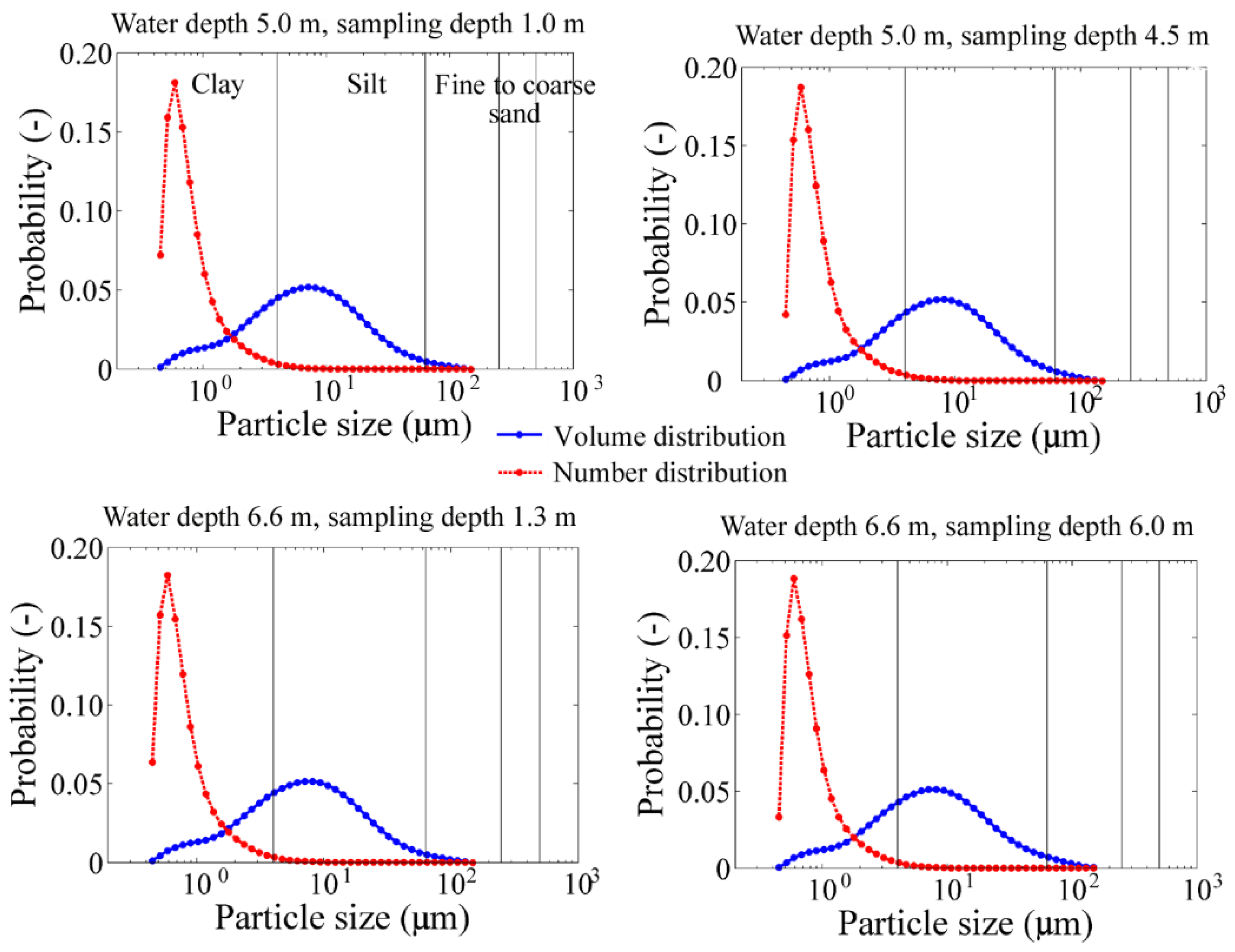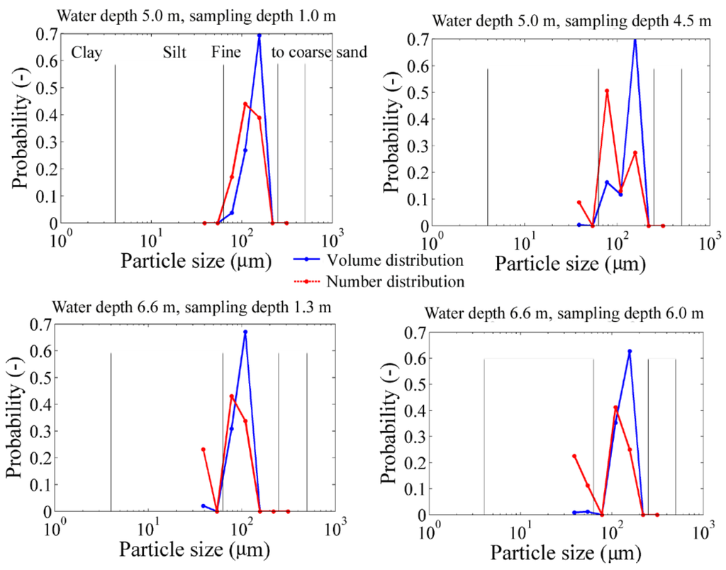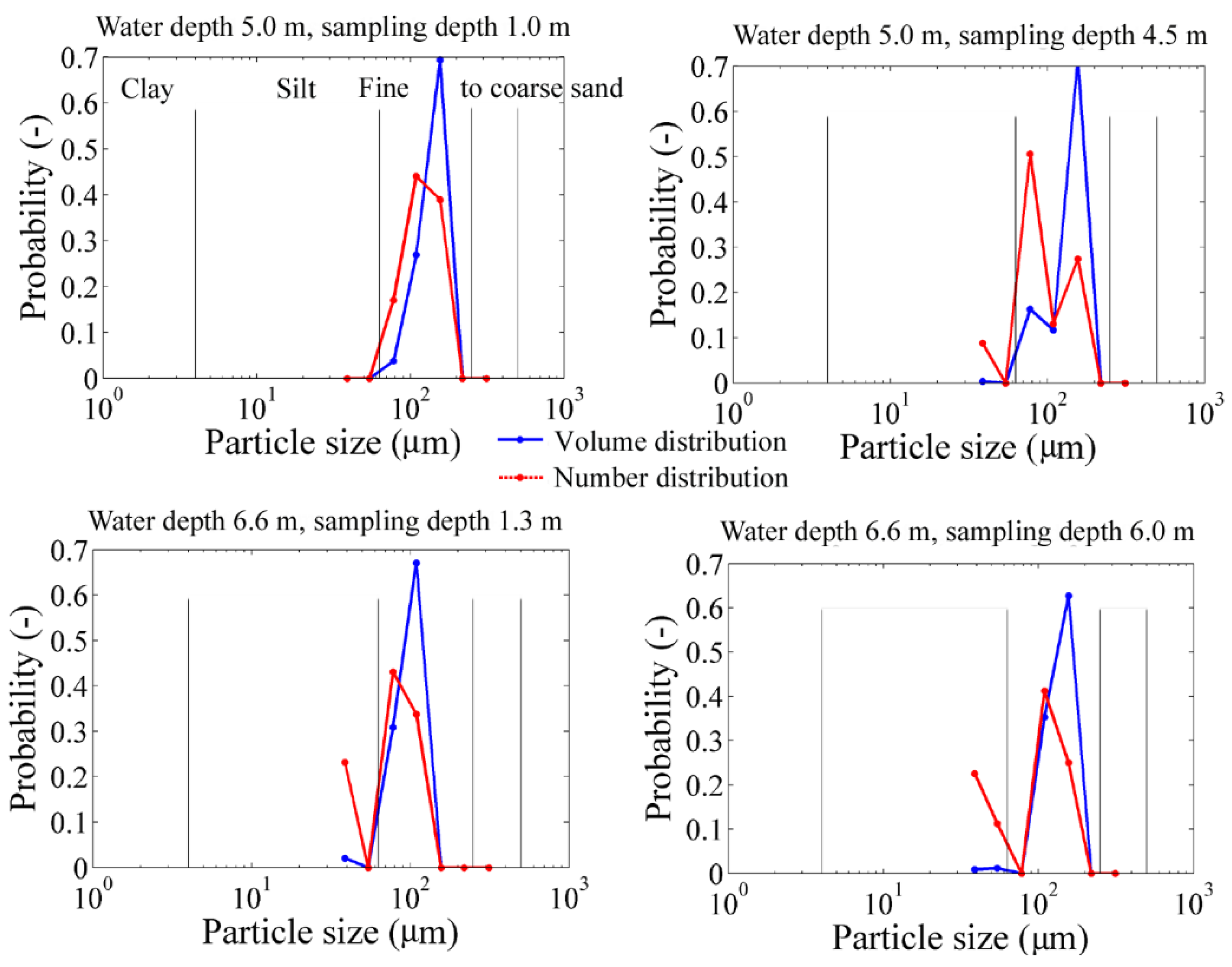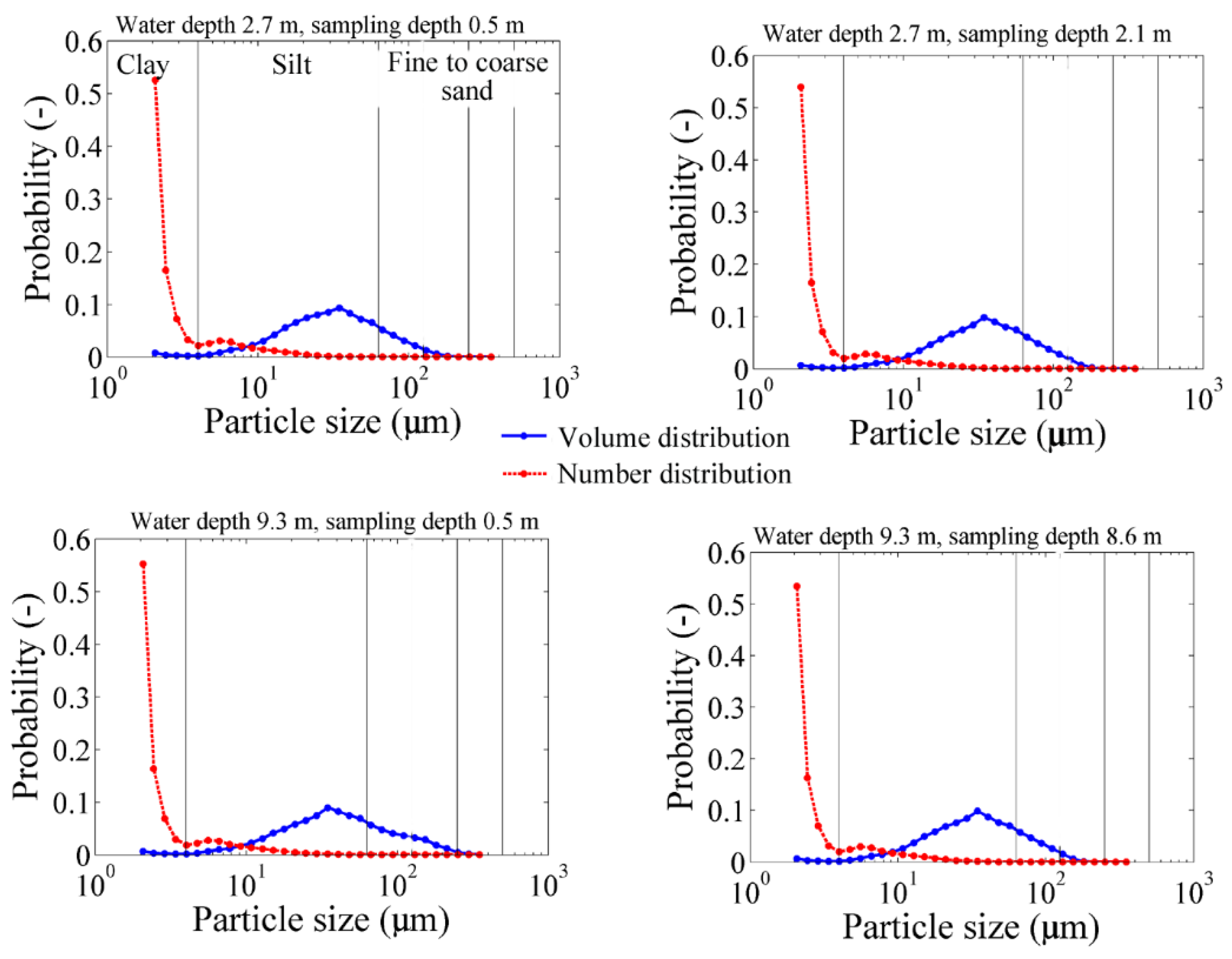 Subset of four PSDs from analysis of wash-load contents: point samples in two verticals with different depths in the secondary reach Colastiné of the Parana system.