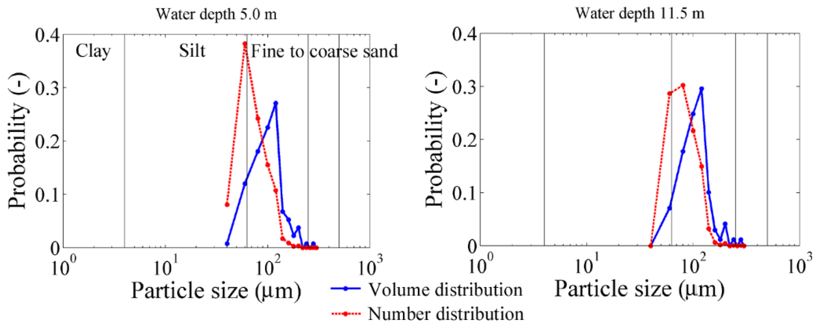 It is worth noting that, in the acoustic theory, the PSD, p(a), as it is reported in Subsection 2.2, refers to the number size distribution rather than to the volume (or weight) size distribution which is used in sedimentological studies. Number and volume distributions may be rather different especially for prevailing amounts of clay-silt fractions over sand because a large amount of small particles results in the same volume as only a few coarse particles. This was evident for PSDs from the Danube and for wash-load content characterizing the Parana secondary reach Colastiné, as for the subset reported in Figure 4 and Figure 5, and as it can be seen for the entire dataset in Table 1.