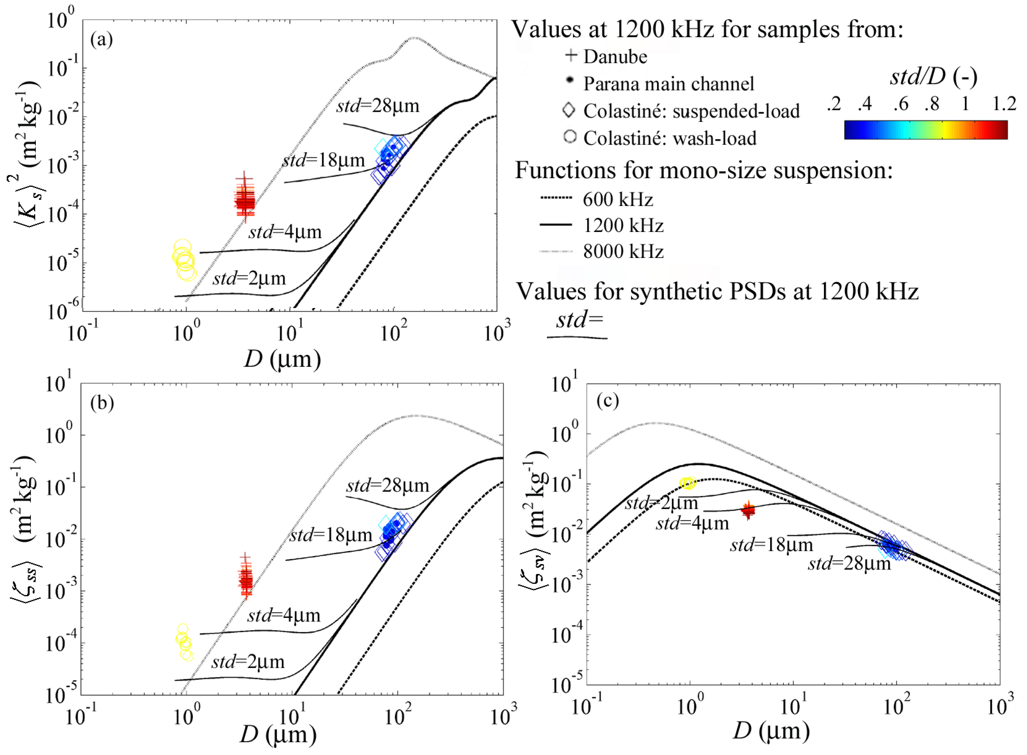 In addition, in the case of attenuations, the std/D ratio could be correlated to coefficients deviations from corresponding values of 1200 kHz mono-size functions, although with a lower magnitude and an inverse proportionality for the viscous normalized coefficient. Actually, the deviations for sampled sand fractions appeared negligible (Colastiné suspended-load and Parana main channel in Figure 8b,c), while increasing std/D values for wash-load content from Colastiné and Danube rivers resulted in noticeable increase and slight drop for backscattering and viscous coefficients, respectively, with respect to corresponding mono-size values.