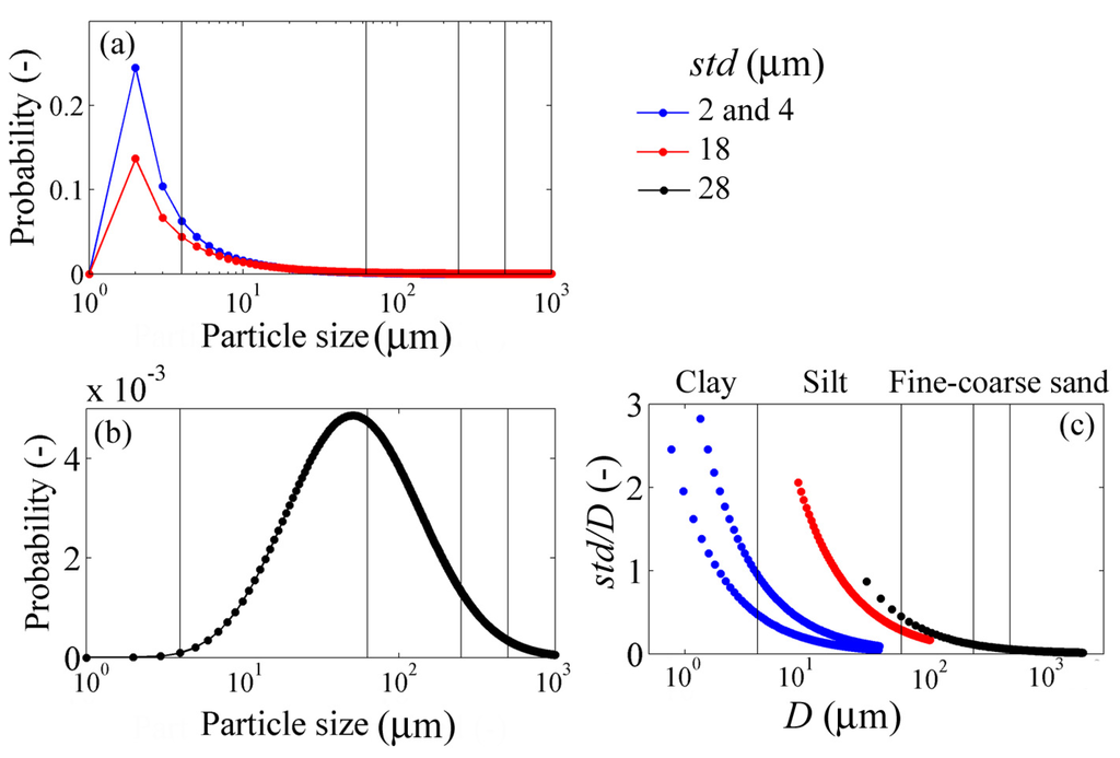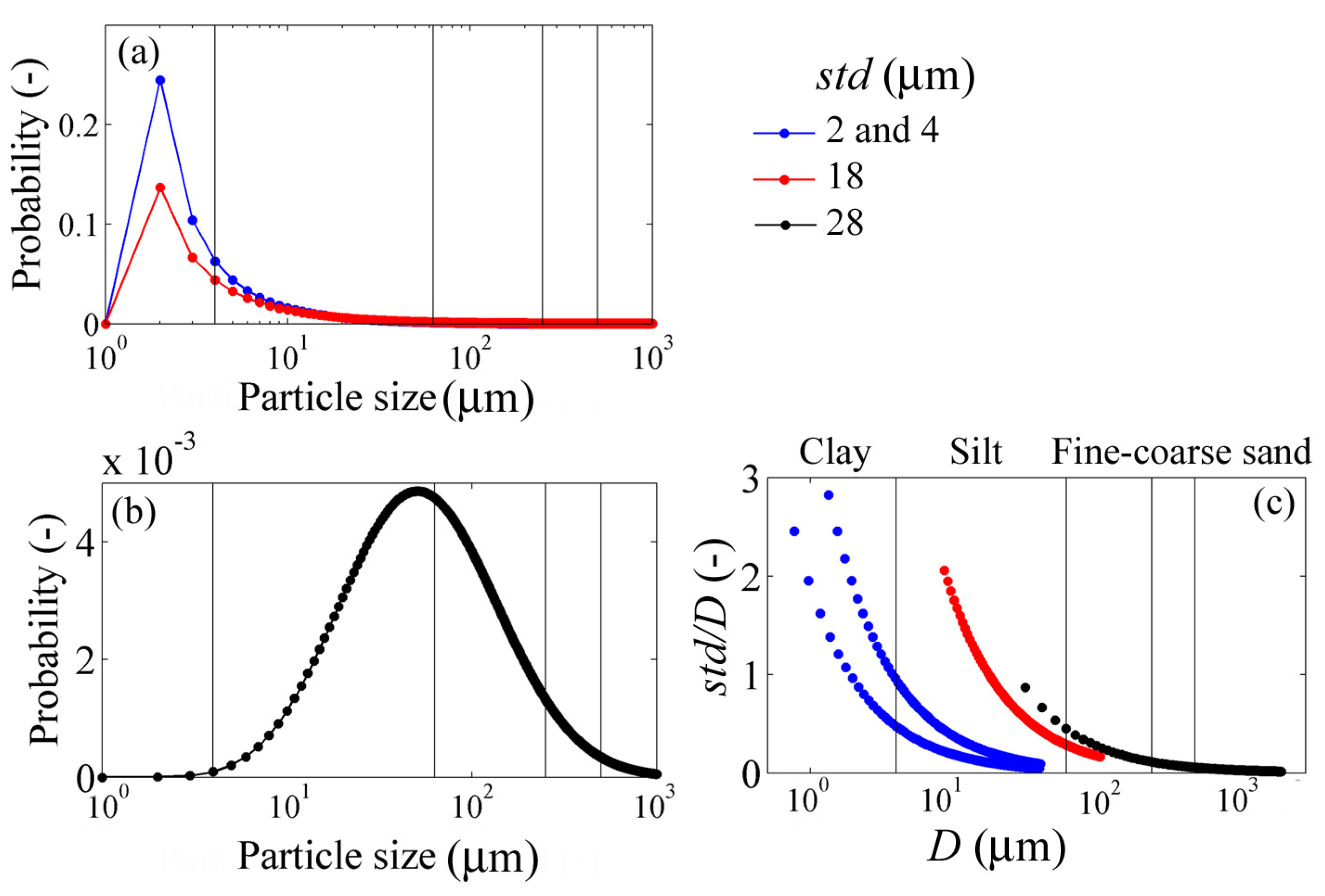 Generated lognormal number distributions (i.e., synthetic PSDs) for (a) clay-silt fraction and (b) sand fraction; (c) Particle mean sizes and corresponding standard deviation over mean size ratios for the synthetic PSDs.