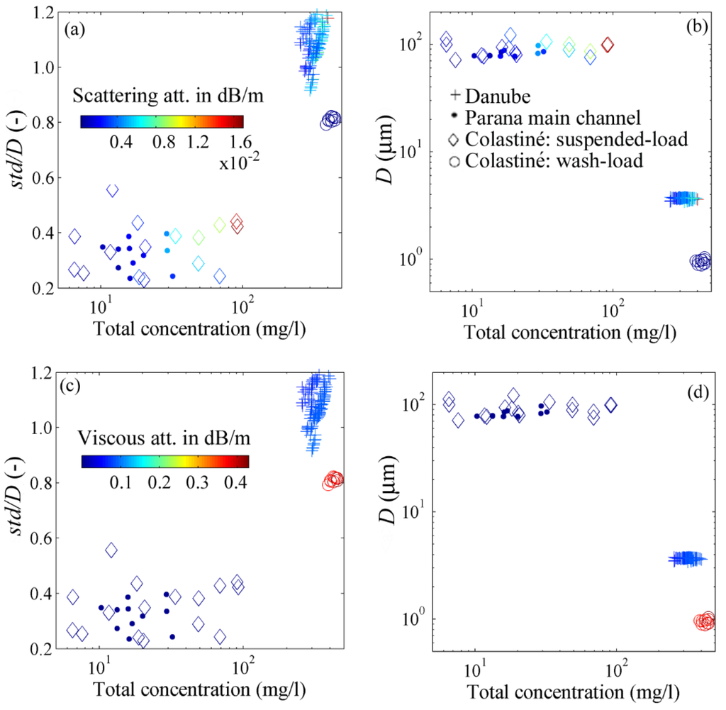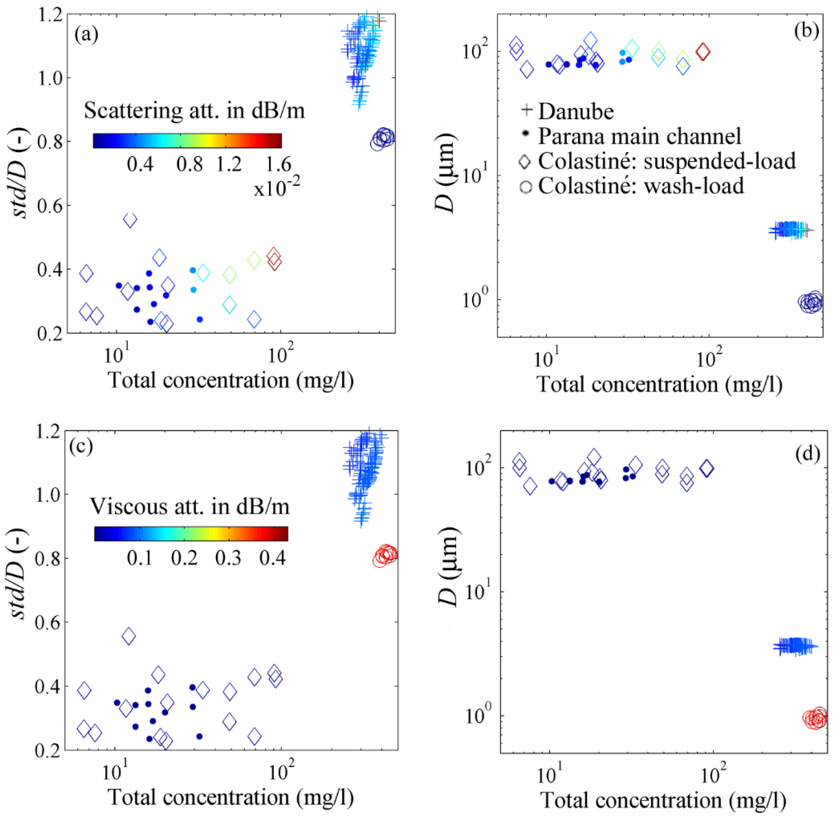 Although the larger sensitivity to actual PSDs, the scattering attenuation normalized coefficient, on average, was one and three orders of magnitude lower than the corresponding viscous coefficient when considering the Danube measurements and the wash-load content in the Colastiné River, respectively.