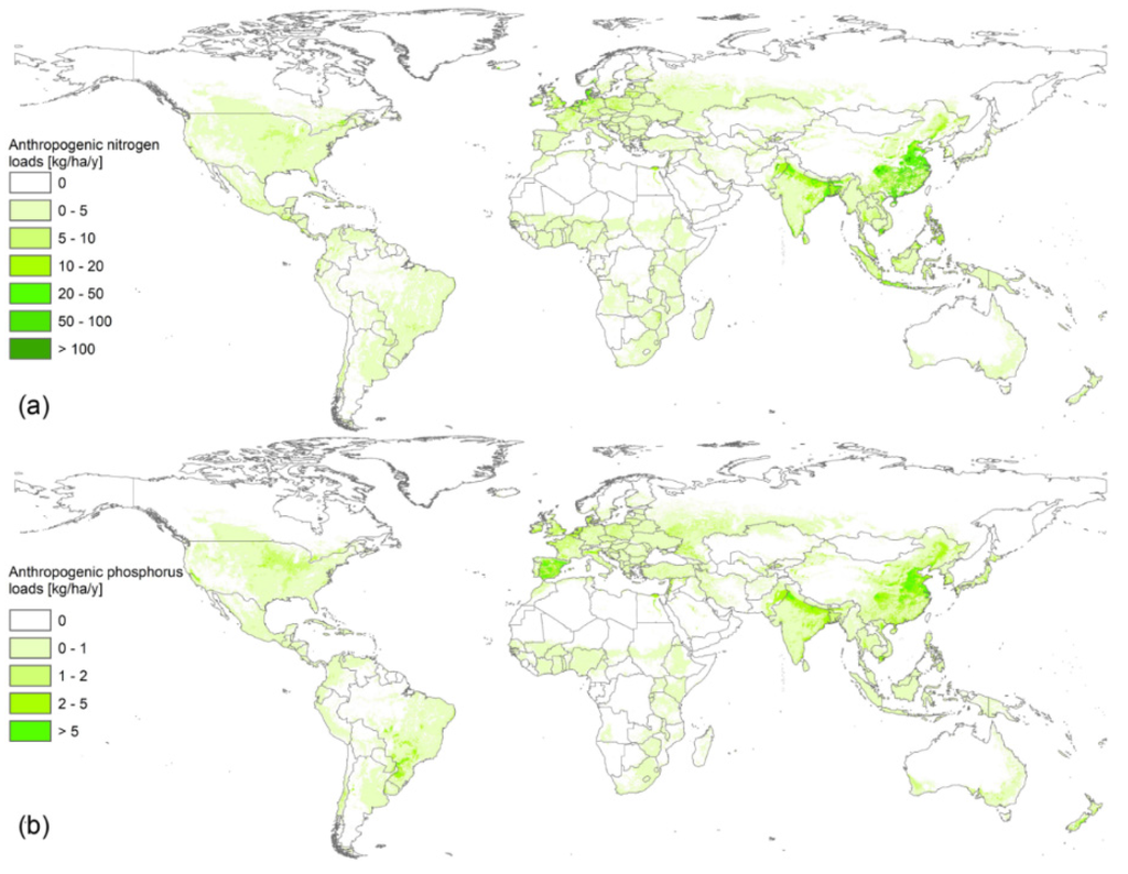 Map of global anthropogenic loads of (a) nitrogen and (b) phosphorus due to global production of crops shown in kg/ha on a 5 by 5 arc-min grid. Period: 2007.