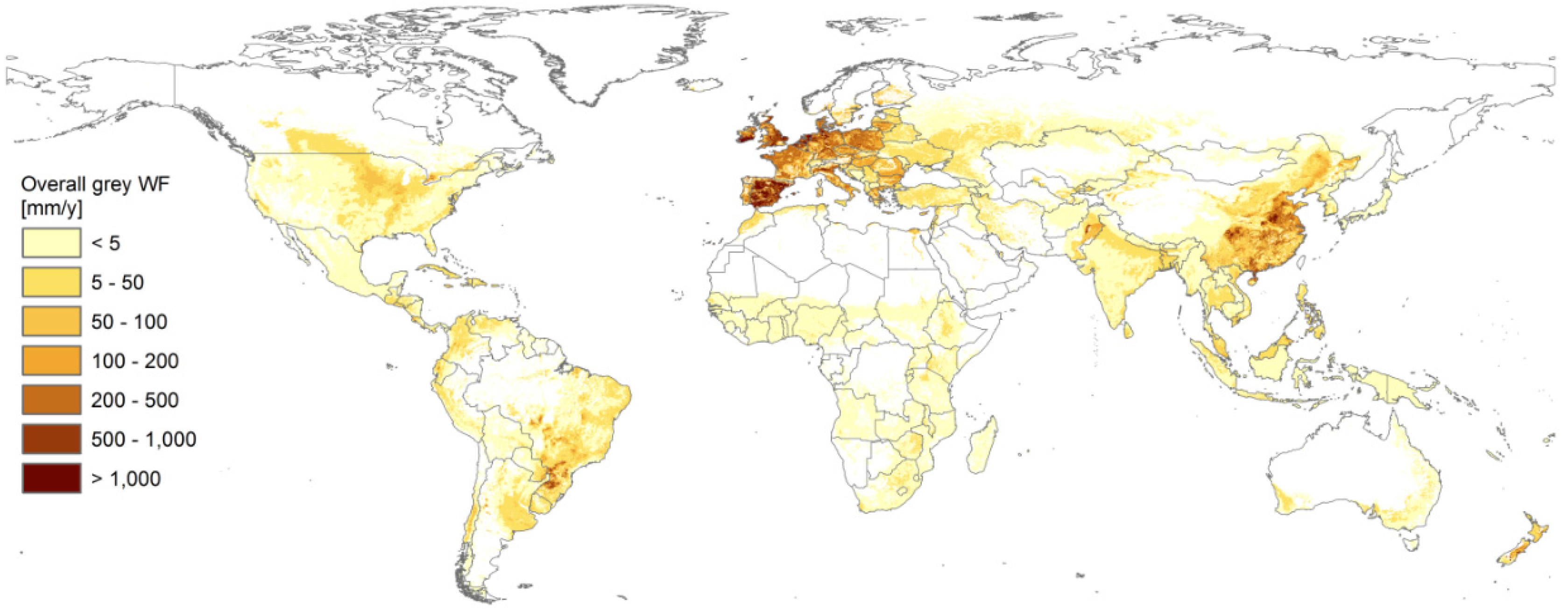 Figure 3 shows a number of darker areas within the EU-27, which can be explained by the fact that about 59% of the GWF of consumption of the EU-27 is internal (within EU-27). The other darker area is in Eastern China, which is due to both the large volume of oil crops and cereals imported from China, and an excessive fertilizer application rate in China.