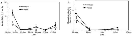 - Popko, D.A.; Walton, W.E. Small-stature emergent macrophytes and crepuscular sprinkler disturbance reduce mosquito abundance in wetland mesocosms. J. Vector Ecol. 2013, 38, 379–389. [Google Scholar] [CrossRef] [PubMed]