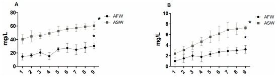 Trend of NO3 (A) and PO4 (B) measured during the trial in two aquaponic systems (aquaponic freshwater, AFW and aquaponic saltwater, ASW). Knots represent the means of triplicate groups; bars indicate SD. Statistical significance is labelled with asterisks (p < 0.05).