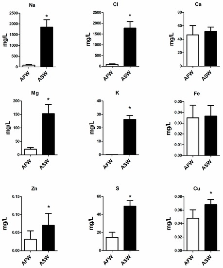 Concentration of Na, Cl, Ca, Mg, K, Fe, Zn, S, Cu in AFW and ASW groups, measured at the end of the trial. Statistical significance is labelled with asterisks (p < 0.05), bars indicate SD.