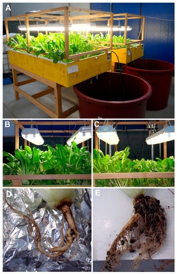 Different phases of sampling. (A) Experimental marine aquaponic systems; (B) Chard cultivated in AFW; (C) Chard cultivated in ASW; (D) Chard root grown in AFW; (E) Chard root grown in ASW.