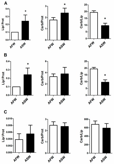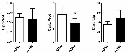 Lipid to protein, carbohydrate to protein and carbohydrate to lipid ratio in European sea bass muscle, reared in AFW and ASW. Statistical significance is labelled with asterisk (p < 0.05), bars indicate SD.
