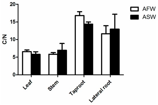 Carbon to nitrogen ratio (C/N) in leaf, stem taproot and lateral root of Beta vulgaris var. cicla cultivated in AFW and ASW. Bars indicate SD.