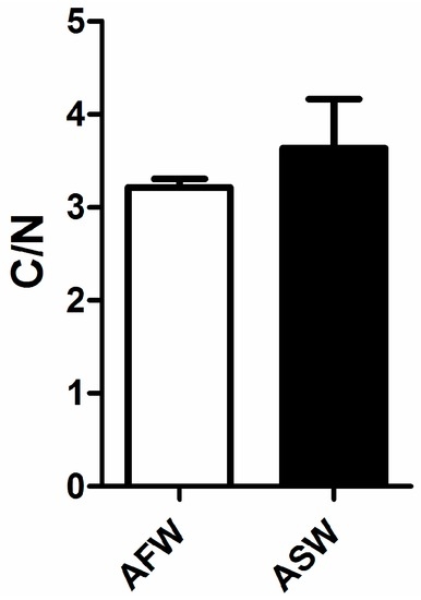 Carbon to nitrogen ratio in the muscle of European sea bass in the two groups (AFW and ASW). Bars indicate SD.