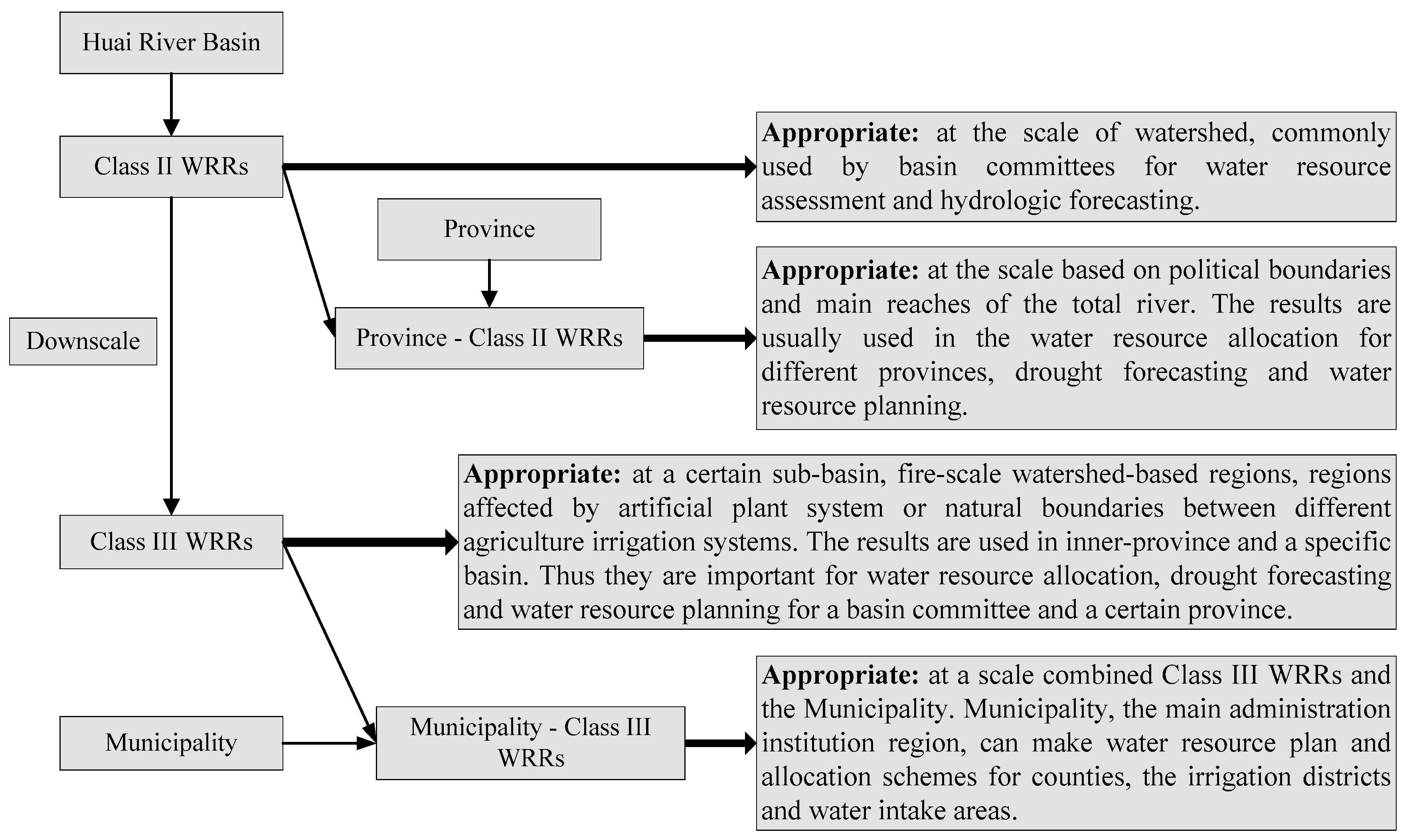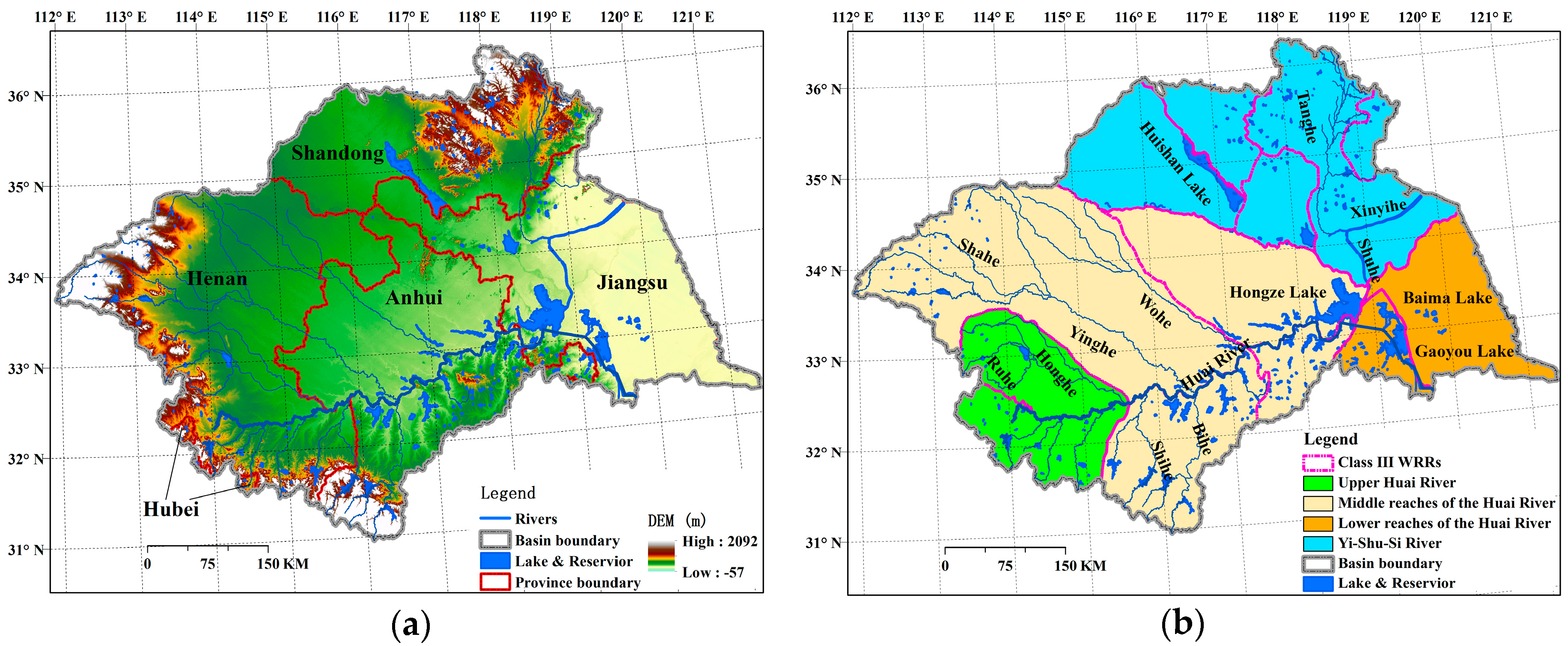 - Water Resources Regions (WRRs): They contain different classes, essentially considered as river basins or groups of basins, and were most commonly used as large-scale watershed-based regions in past studies. In this paper, the WRR mainly refers to the Class I WRRs: the Huai River Basin.
