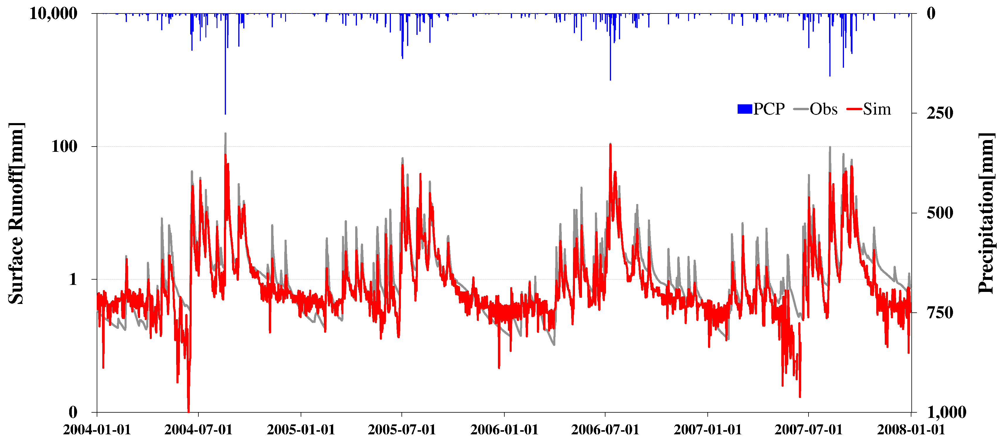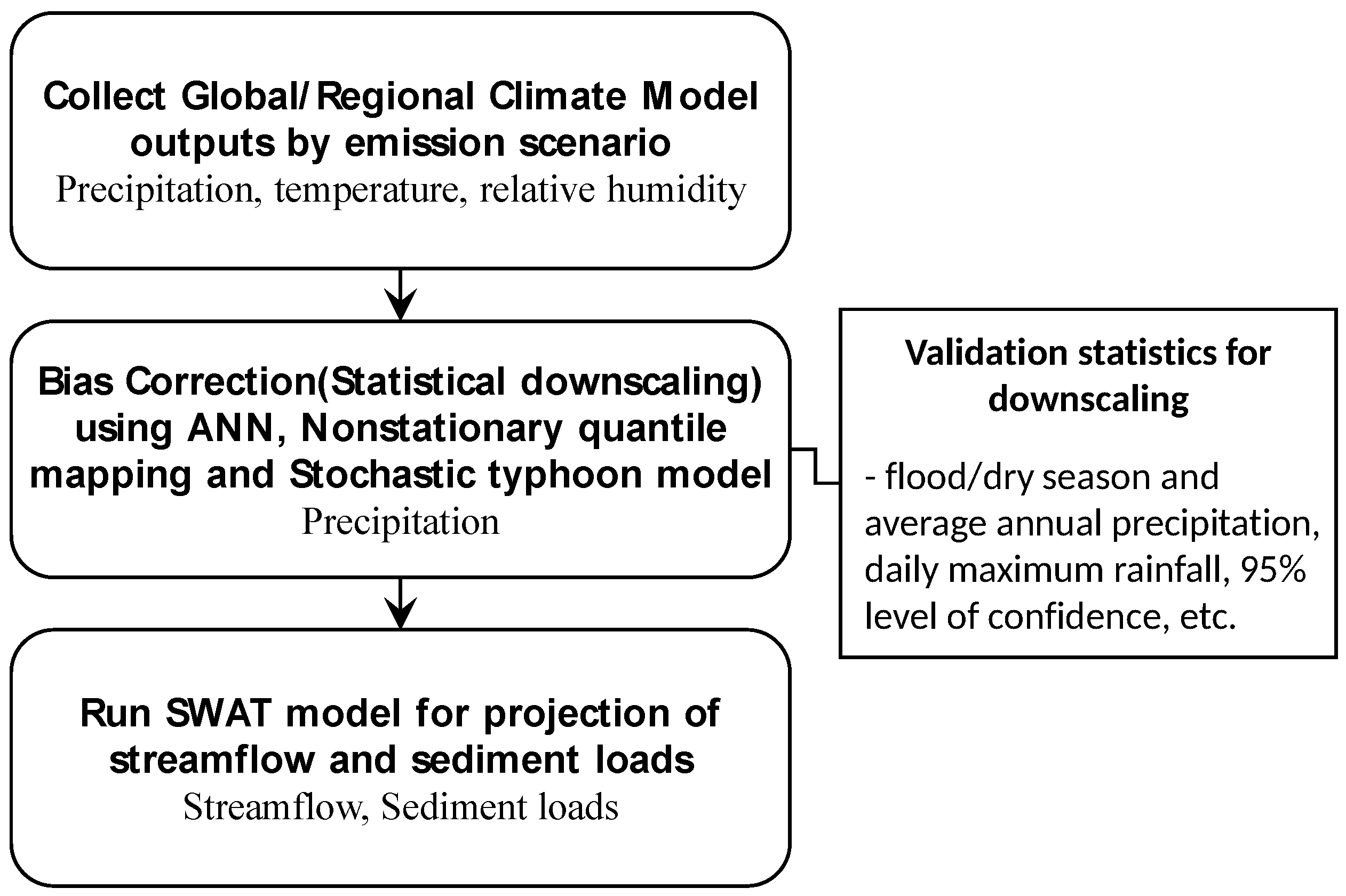 In this study, for the purpose of the reliable prediction of sediment yield in the watershed, the fine-scale projections for hydro-climate components were obtained first using the statistical bias correction and downscaling scheme based on the combination of ANN, Nonstationary Quantile Mapping (NSQM) and Stochastic Typhoon Synthesis (STS) sub-modules. Successively, the hydrologic runoff and sediment yield from the land surfaces were predicted through the long-term continuous watershed model, SWAT, using the bias-corrected and downscaled Regional Climate Model (RCM) output under the Intergovernmental Panel on Climate Change’s (IPCC’s) A1B climate change scenario.