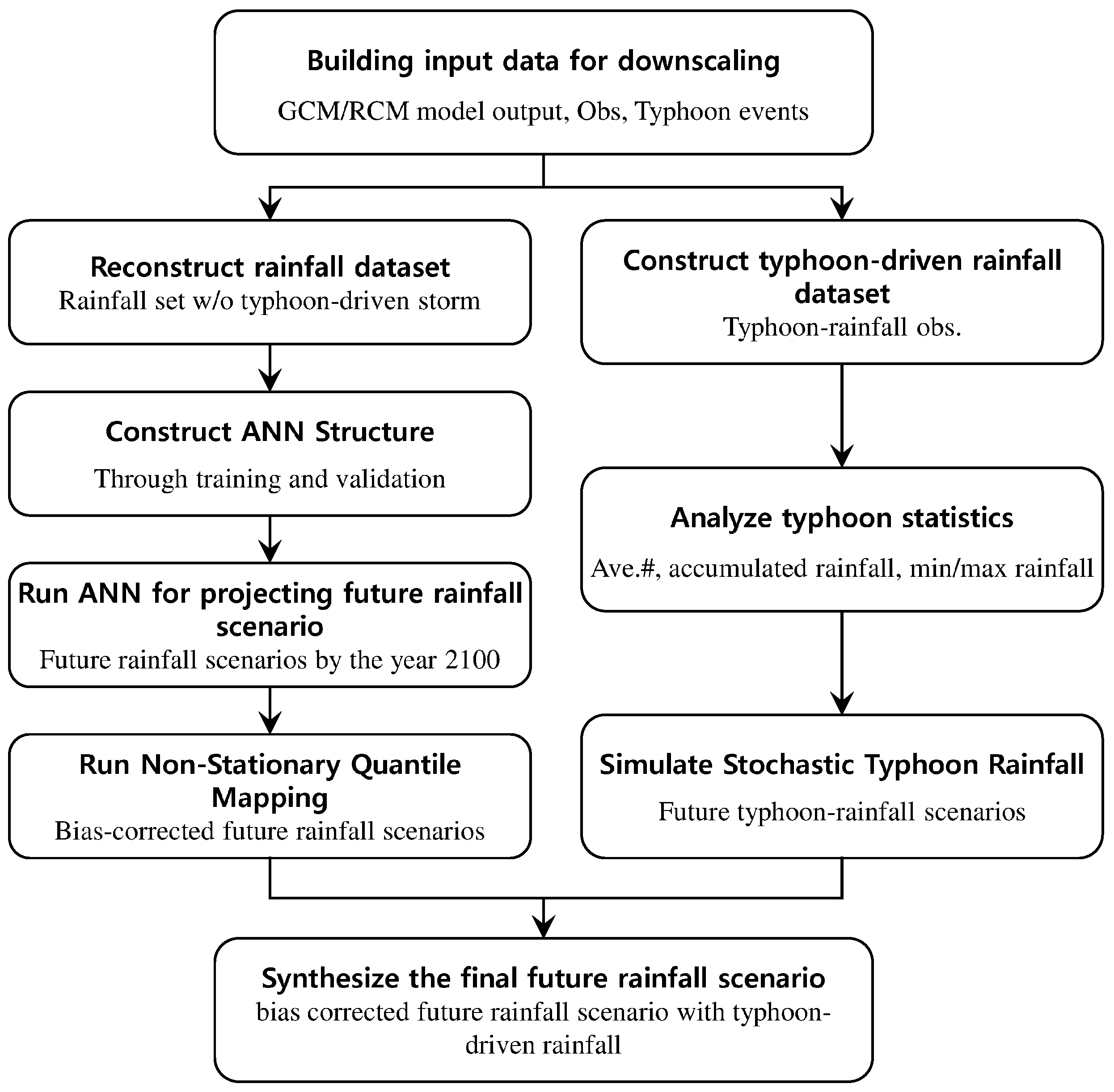 27]. In this study, in the process of producing the hydro-climate scenario with typhoon rainfall, the ANN training was carried out after eliminating the typhoon events that occurred during the flood season; the separately-simulated typhoon rainfall was then superimposed on the downscaled GCM output (