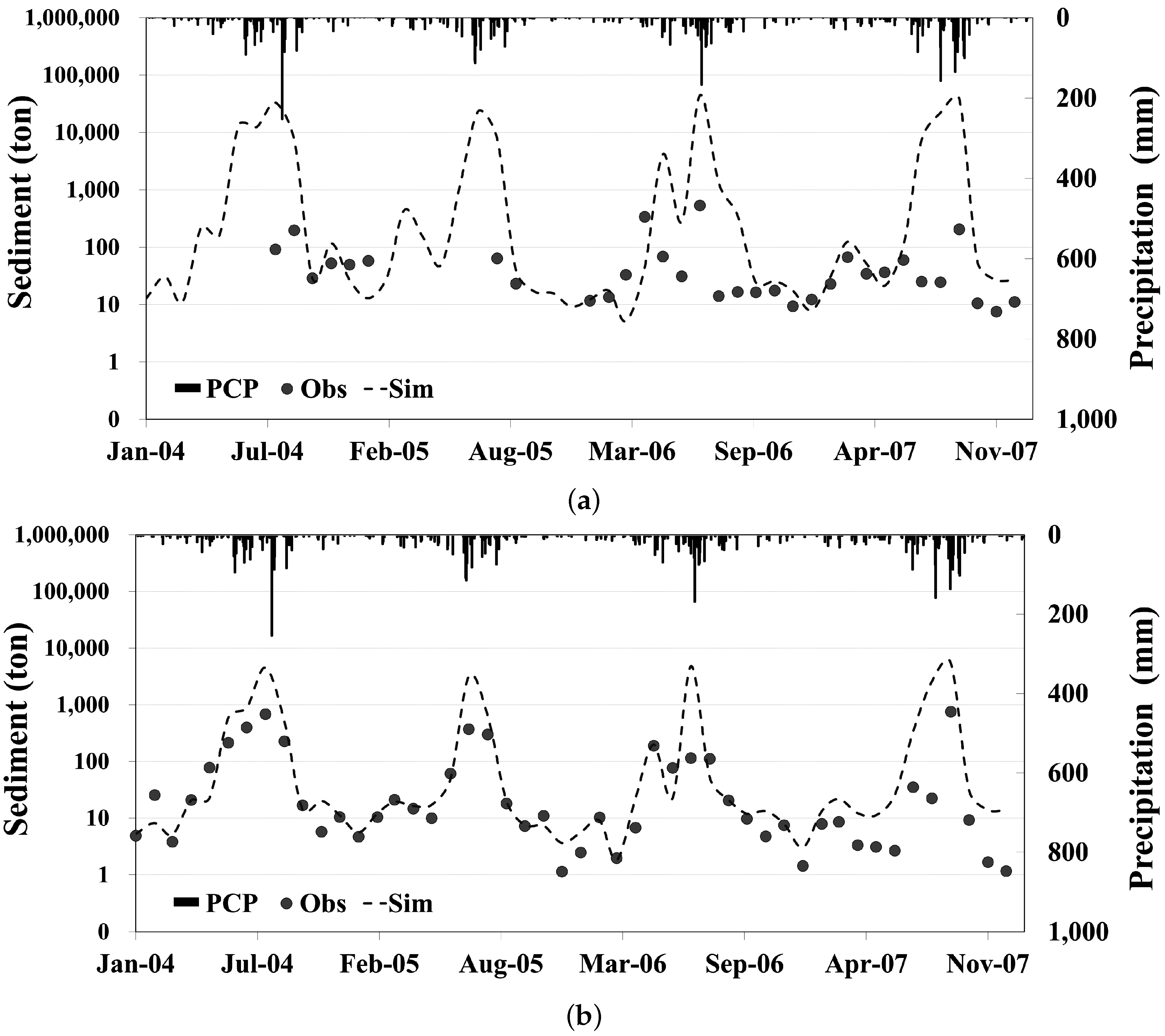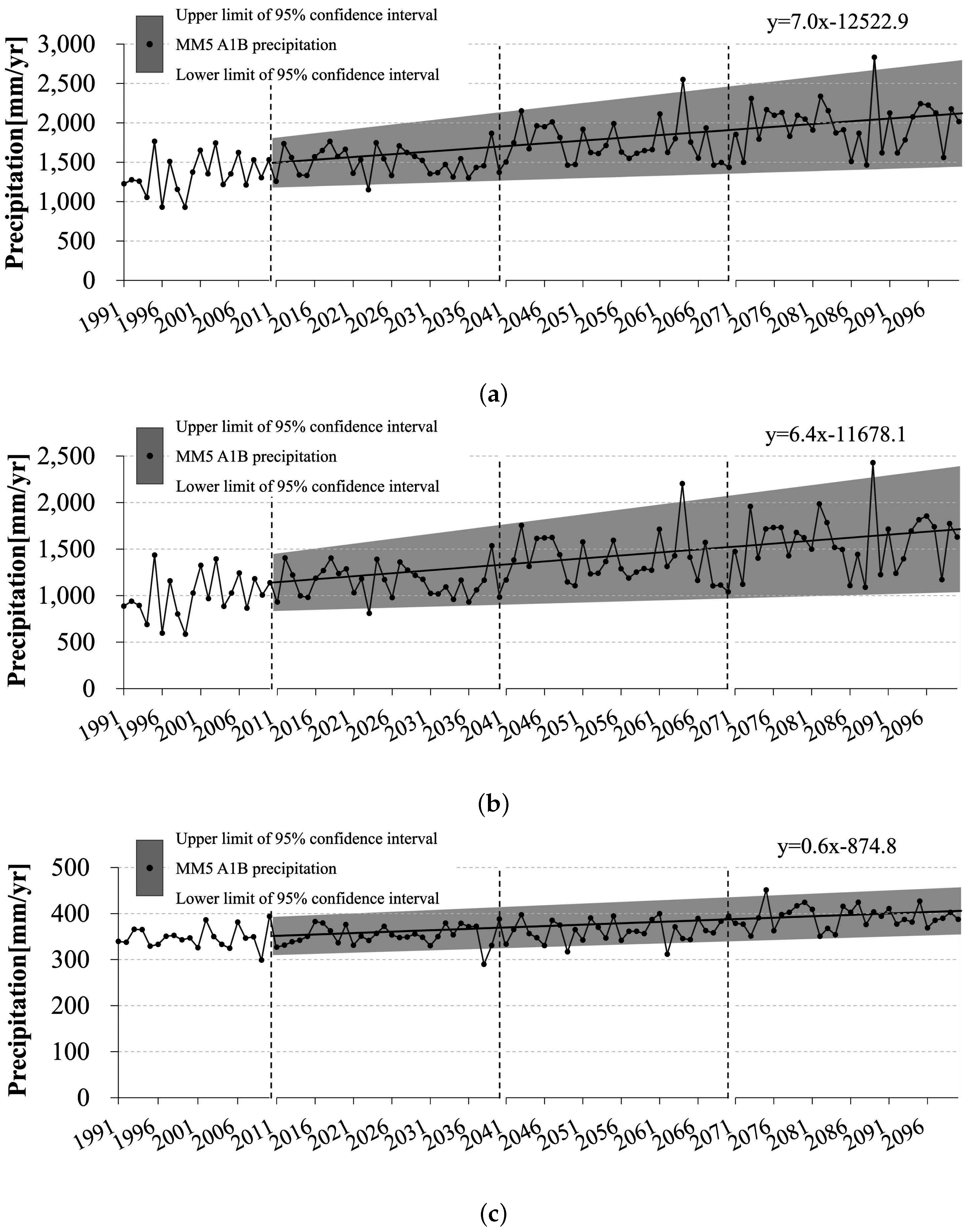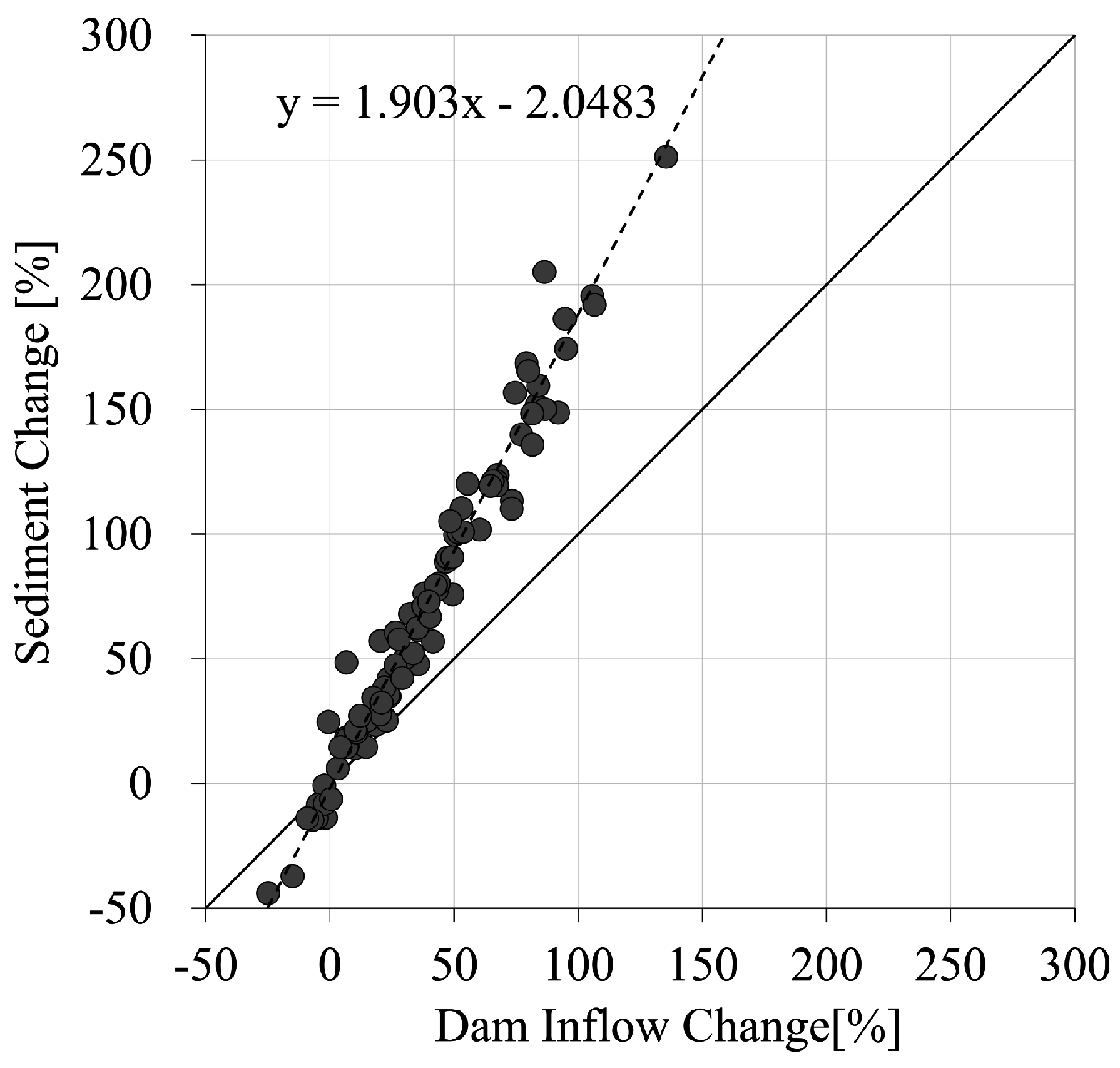 As introduced in the section of the literature review, the results in this study were compared qualitatively with additional recent case studies in various regions of America, Europe, India and China. Under a similar precipitation scenario, the impacts on sediment runoff show different regimes. The quantitative rate of increase or decrease largely depends on climate change scenarios and spatio-temporal scales, input data quality, etc. Even though there is still insufficient understanding of the nonlinear relationship between rainfall intensity and sediment detachment from the land surface, the above results indicate the need for preparing countermeasures for protecting basin land surfaces from soil loss and their impacts on ecosystems. Effectively integrated water resources management could be achieved through the reliable assessment of regional vulnerability against potential impacts under climate change.