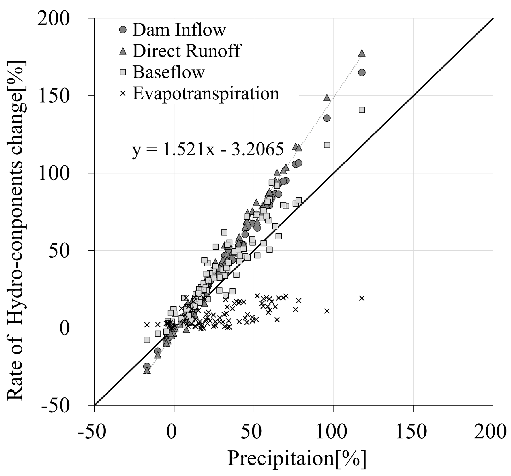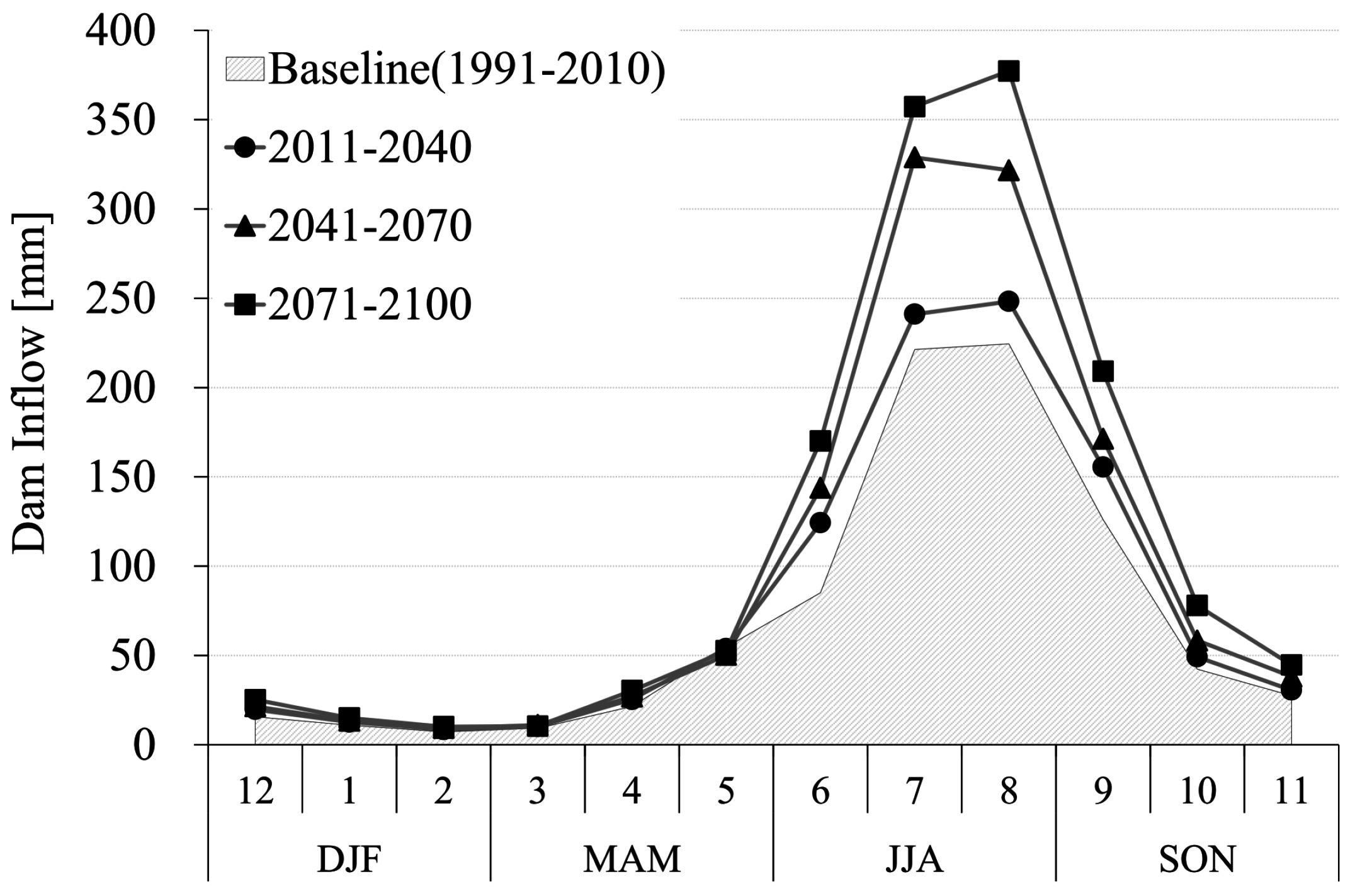 5]. In spite of the increase of future summer precipitation, sediment yield during the summer season was predicted to decrease owing to an increase in soil moisture deficit and evapotranspiration, meaning an increase in precipitation loss [