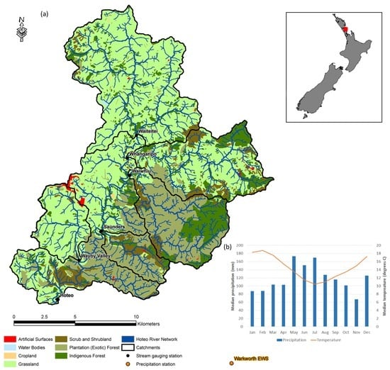 (a) The Hoteo catchment (located on the North Island, NZ) and its five sub-catchments (black lines) delineated based on the location of gaging stations. Land cover (LCDB v3.3) is shown for reference. Precipitation data were drawn from Warkworth EWS climate station, located 8 km south-east of Hoteo; (b) Climograph created from data drawn from Warkworth EWS climate station for the period 2000–2013.