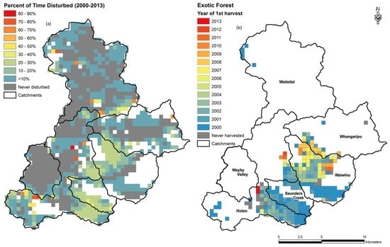 The spatial distribution of disturbances among high-producing grasslands and exotic forests was variable across the catchment (Figure 2a). Individual pixels were disturbed from 0–83% of the time. Moderate-to-high disturbance frequency (yellow-orange color) was found in Waiwhiu, Whangaripo, and Saunders, as well as near the Hoteo watershed outlet. Some very disturbed pixels (red color) were spread across the watershed, and are results of areas with mixed land cover (e.g., human structures like houses and roads in grassland pixels). By deriving the time of harvest of the exotic forests (Figure 2b), we found that most of the harvesting occurred from 2000–2004 (blue-green color), with 65% of that class being disturbed during the first four years of the record. Most of the exotic forestry was located in Waiwhiu, Saunders, and Whangaripo. The latest harvests occurred along the border of Waiwhiu–Whangaripo. Overall, the percentage of the Hoteo catchment disturbed ranged from 2.0%–13.7% at any given time with a mean of 7.3% for the 2000–2013 period.