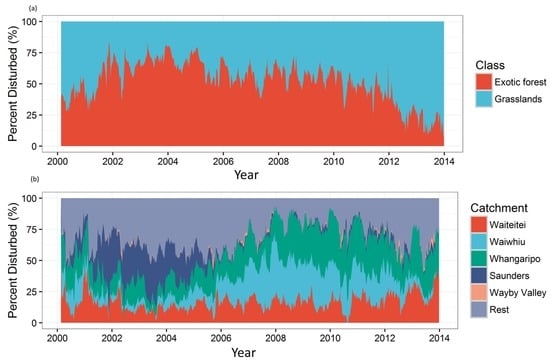 The relative contribution to disturbance by land cover also varied over our study period (Figure 3a). Exotic forestry contributed most of the observed land disturbance from 2000–2010 and decreased significantly after 2012. In general, exotic forests were more disturbed, with a mean of 14.9% of the class being disturbed (max of 38% at 14 September 2003 and min of 0.4% on 19 December 2013). Grasslands were less disturbed with a mean of 4% (max of 11.2% at 1 May 2002 and min of 0.7% on 17 November 2001).