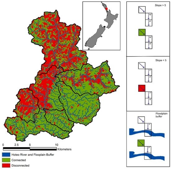 The River Environment Classification (REC) is a national-scale (for New Zealand) synthetic stream network derived from a hydrologically corrected DEM []. Utilizing “fixed” thresholds on flow accumulation layers to identify the location of channel heads (like REC) is computationally efficient over large areas, but with limitations on the accuracy of the headwater locations []. For that reason, we identified all channel heads of the Hoteo catchment using 0.5 m rural aerial photos from 2010–2012 (Land Information New Zealand; LINZ) as reference. Then, using a modified stream delineation algorithm (based on flow direction), we were able to delineate streams from their mapped headwaters to the watershed outlet. The newly-created stream network was used as input to inform the variables of our landscape connectivity model, described below.