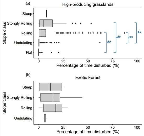 Results of pairwise comparison using the Wilcoxon rank sum test with the Bonferroni correction showed that areas with exotic forestry had significantly more disturbance than high-producing grasslands (p < 0.001). Steep slopes (≥8°) overall (including both grass and forest) had significantly higher disturbance than gentle slopes (0–8°; p < 0.001). Grasslands on steep slopes also had higher disturbance compared to grasslands on gentle slopes (p-value < 0.001; Figure 5).