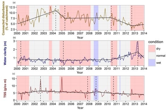 Monthly (a) percentage of catchment connected and disturbed; (b) water clarity (residuals from local polynomial regression (LOESS) + mean clarity; and (c) flow-adjusted TSS (residuals from loess + mean TSS) for the period 2000–2013. The timing of breakpoints (dashed lines) between connected disturbance and water clarity from 2005–2013 seem to coincide, suggesting a cause and effect relationship between the two. Wet (blue), normal (grey), and dry (red) periods were calculated from a 12 month standardized precipitation index (SPI). The segmented regression lines are shown in black.