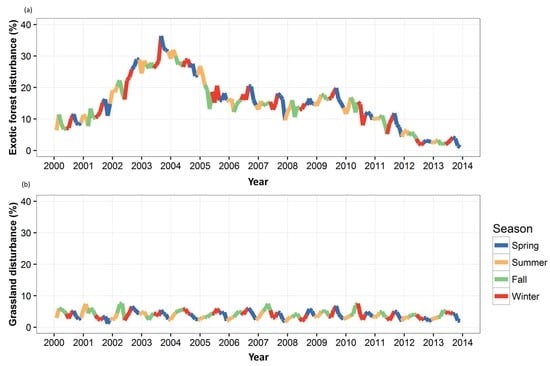 The percentage of grasslands disturbed varied seasonally, with typically higher values during Winter/Spring and lower during Summer/Fall (Figure 7). Exceptions occurred during extended droughts (2000–2001, 2005–2008, 2010, and 2013), when disturbance was highest during Summer/Fall. Exotic forests exhibited similar seasonal behavior, but disturbance increases or decreases (Figure 6) were mostly influenced by forest harvests (Figure 3b) or recovery, respectively—especially during the 2002–2005 period.