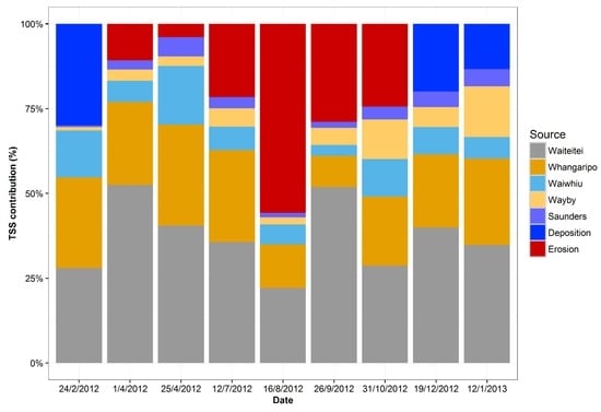 When relative contributions of TSS by sub-catchment for a relatively normal year in terms of precipitation (2012) were analyzed, an interesting pattern emerged (Figure 8). Net loss erosion (more sediment coming from the main channel or lower catchment than delivered by the sub-catchments) occurred during the Winter (July–October), while net storage deposition (more sediment coming out of the sub-catchments than delivered to the catchment outlet) occurred during the Summer (December–February).