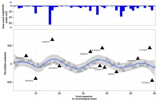 (a) Flow event magnitudes; (b) TSS residuals event (n = 60) analysis from the period 2012–2014 for the Hoteo catchment outlet in order of occurrence showing periods of higher amounts of sediment than expected followed by lower amounts of sediment than expected. The sine-like wave (blue LOESS line with 95% confidence intervals) suggests that after major TSS events (concave), sediment in the landscape is exhausted (convex). Similar patterns were described in Knox’s (1972) [] seminal paper occurring over thousand years or millennia. Our results show that these processes also take place on yearly or monthly time scales. The date (dd/mm/yyyy) is shown on extreme events.