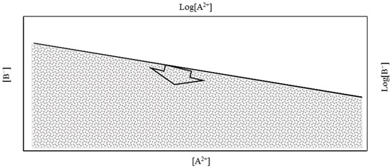 B− should correspond to points in the non-saturated area or on the saturation line. When the concentration of one ion in the solution is known, the maximum possible concentration of the other ion can be estimated from the equilibrium concentration, because higher concentrations will lead to precipitation.