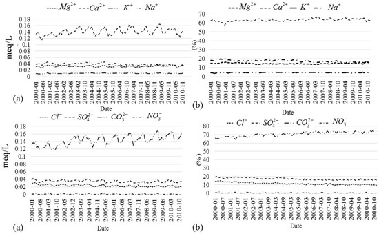 Figure 2b) show less variability around the average values. This is because the concentrations of the different ions co-vary, making the relative concentration, as a percentage, less sensitive to seasonal changes.