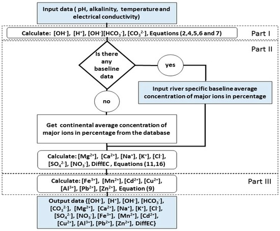 A model was developed that uses only pH, alkalinity, and temperature to estimate the concentrations of major ions (MI) in rivers (Na+, K+, Mg2+, Ca2+, HCO3−, SO42−, Cl−, and NO3−) together with the maximum possible concentrations of minor ions and heavy metals (Fe2+, Mn2+, Cd2+, Cu2+, Al3+, Pd2+ and Zn2+). The model was tested using data from four monitoring stations in Swedish rivers.