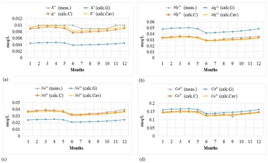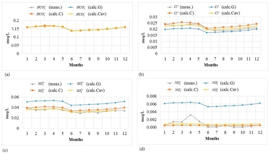 In general, there is a small improvement in the estimated values when using the customized method with Cav (employing annual averages of relative concentrations to calibrate the model) compared to the customized method with C (employing a single sample during a base month to calibrate the model). This small improvement is reasonable since the annual averages used to calibrate the model take into consideration the variability of the concentration of each ion due to seasonal changes.