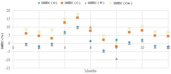 DiffEC(%) was also calculated when estimating the concentrations of ions at the four stations used to validate the model, see Equation (13). As an example,