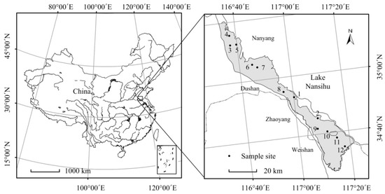 Location of Lake Nansihu and the sample sites in the lake. This figure was generated using ArcGIS Version 10.0 (ESRI, Redlands, CA, USA).