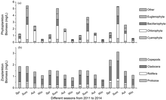 The biomasses of (a) phytoplankton and (b) zooplankton in different seasons from 2011 to 2014. Spr: spring, Sum: summer, Aut: autumn, Win: winter.