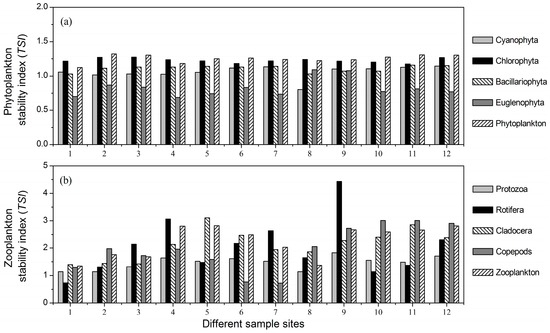 The stability indices of (a) phytoplankton and (b) zooplankton taxa at the 12 sample sites. TSI, temporal stability indices.
