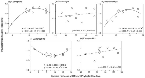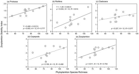Relationships between phytoplankton species richness and the stability of (a) protozoa; (b) rotifer; (c) Cladocera; (d) copepods and (e) zooplankton stability.