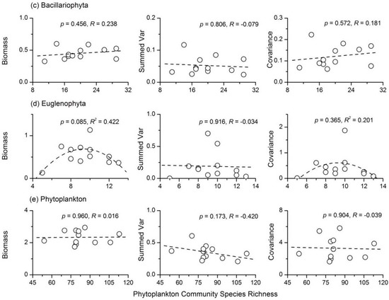 The Cyanophyta stability index had a unimodal relationship with species richness, and it reached the maximum value when Cyanophyta species richness was 13 (Figure 5a). Further analyses showed that Cyanophyta species richness had a concave relationship with summed variance, but a weak negative relationship with average total biomass (Figure 6a). However, the summed covariance of Cyanophyta had a weak concave relationship with species richness. There was no apparent relationship between Chlorophyta species richness and stability (R = 0.239, p > 0.05). However, the three components of Chlorophyta stability all showed concave relationships with species richness (Figure 6b). There was also a unimodal relationship between Bacillariophyta species richness and the stability index (Figure 5c). However, the correlation coefficients between the three components of Bacillariophyta temporal stability and species richness were all not significant (Figure 6c). A concave relationship was observed between the species richness and stability of Euglenophyta, as shown in Figure 5d. Euglenophyta stability reached the minimum value when its species richness was nine. The three components of Euglenophyta temporal stability were not influenced by species richness (Figure 6d). Both the summed variance and covariance of Euglenophyta were relatively low when the species richness was high (Figure 6d). The correlation coefficient between total phytoplankton species richness and stability was not significant (R = 0.285, p > 0.05). The weak negative relationship between phytoplankton species richness and its summed variance was responsible for this phenomenon (Figure 6e).