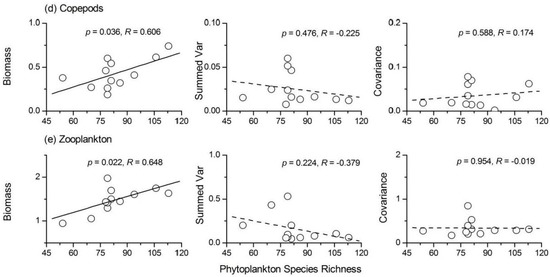 Phytoplankton species richness was positively correlated with the stability of protozoa (Figure 7). Phytoplankton species richness had a weak positive relationship (R = 0.405, p > 0.05) with the average total biomass and a weak negative relationship (R = −0.407, p > 0.05) with the summed variance of protozoa (Figure 8a). There was also a positive relationship between the stability of Rotifera and phytoplankton species richness (Figure 7b). The three components of Rotifera temporal stability were all negatively correlated with phytoplankton species richness (Figure 8b). The influence of phytoplankton species richness on the temporal stability of both Cladocera and copepods was not significant (for Cladocera, R = 0.377, p > 0.05; for copepods, R = 0.490, p > 0.05). The summed variance and covariance of the two taxa were not affected by phytoplankton species richness (Figure 8c,d). The average total biomass of Cladocera and copepods increased with increasing phytoplankton species richness (Figure 8). The relationship between phytoplankton species richness and total zooplankton stability was also positive (R = 0.703, p < 0.05), as shown in Figure 7e. The strong positive relationship between phytoplankton species richness and the average total biomass of zooplankton (Figure 8e) was responsible for this phenomenon. In addition, a weak negative relationship between the summed variance of zooplankton and phytoplankton species richness was observed (R = −0.379, p > 0.05).