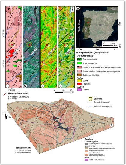 Regional framework of the study area (Caldas da Cavaca hydromineral system, Aguiar da Beira), based on [25,39,40,41]: (A) Regional location of the study site (Central Portugal); (B) shaded relief and regional hydrogeology; (C) Satellite image and tectonic lineaments; (D) Slope; (E) Land cover; (F) Block diagram illustrating the basic geological framework of the study site.
