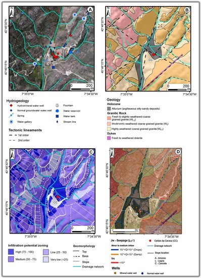 Local hydrogeological framework of Caldas da Cavaca site, revised and updated from [26,27,40]. Hydrogeological inventory (A); geology and geotechnical framework (B); hydrogeomorphology and infiltration potential zoning (C); hydrogeomechanical assessment based on seepage parameter (JW—joint water reduction) on selected rock masses (D).