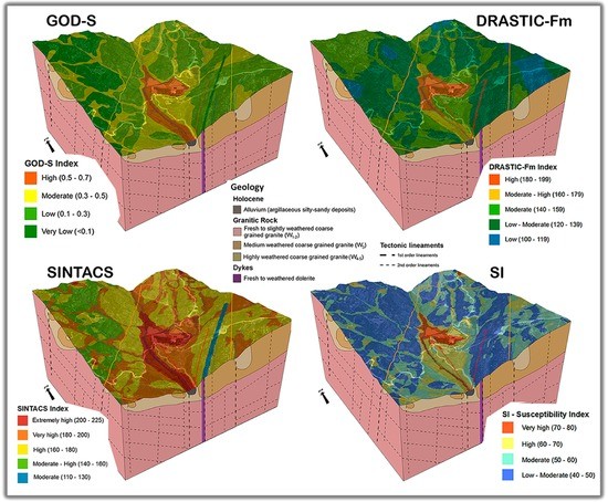 The GOD-S, DRASTIC-Fm, SINTACS and SI multi-criteria indexes are often used for local and regional mapping purposes (medium to small-scale), and the DISCO index [34] is very useful for in situ environmental hydrogeological investigations (large-scale maps). The most efficient methodology is an integrative approach encompassing all previous multi-criteria indexes [22].