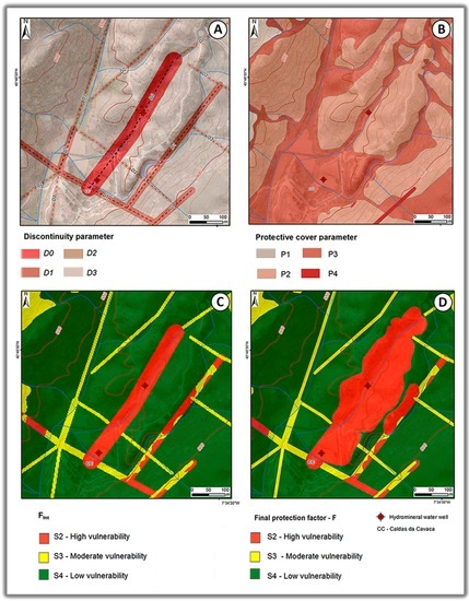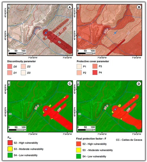 DISCO method applied to a spring at the Caldas da Cavaca site: (A) discontinuity parameter; (B) protective cover parameter; (C) intermediate protection factor (); (D) final protection factor (F).