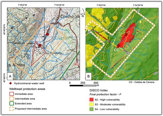 Wellhead protection areas for Caldas da Cavaca hydromineral system: (A) wellhead protection areas defined in 1996; (B) proposed intermediate wellhead protection area.