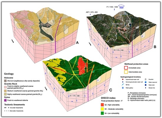 Depending on the conversion between the protection factor F and the groundwater protection zones defined by Pochon et al. [34], the relation between and groundwater protection zones (S) is the following (Figure 7C): (i) Zone S2 is compatible with (2, 3, 4) where the values 2, 3 and 4 are related to lineaments and to the moderately to highly weathered coarse grained granite ( to ; (ii) Zone S3 is compatible with (5, 6, 7) where the values 5 and 6 are related to some lineaments and value 7 is related to the fresh to slightly weathered coarse grained granite (.