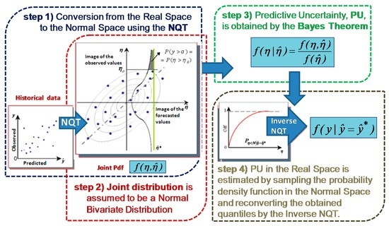 Since multivariate joint distributions can be formulated and effectively analytically treated in a very limited number of cases, Krzysztofowicz [14] suggested transforming the observations and model forecasts into a Gaussian or normal space via a non-parametric transformation based on the Normal Quantile Transform (NQT) [23,24,25]. The MCP application is based on four steps depicted in Figure 1.