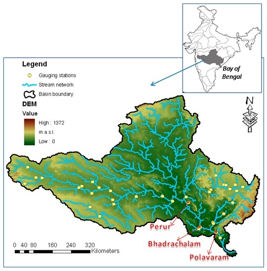 Since the mid 1960s, the Central Water Commission is conducting hydro-meteorological observations in the Godavari basin. Specifically, hydrometric observation stations have been established on main Godavari River as well as on all the important tributaries. The monitoring network consists in more than 60 gauged stations, the location of most of which is shown in Figure 2 where the three gauged river sites selected for the study are also highlighted (Perur, Bhadrachalam and Polavaram hydrometric stations).