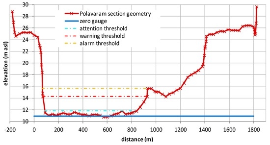Godavari River: geometry of the Polavaram section where the stage forecast and the PU estimate are provided. The zero gauge level is shown along with the assumed hydrometric thresholds.